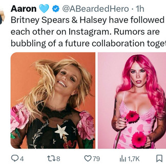 *Britney e a cantora Halsey se seguiriam mutuamente no Instagram, o que levantou novas especulações de fãs. Halsey inclusive fará uma suposta homenagem para Britney em uma música chamada "Lucky" também.